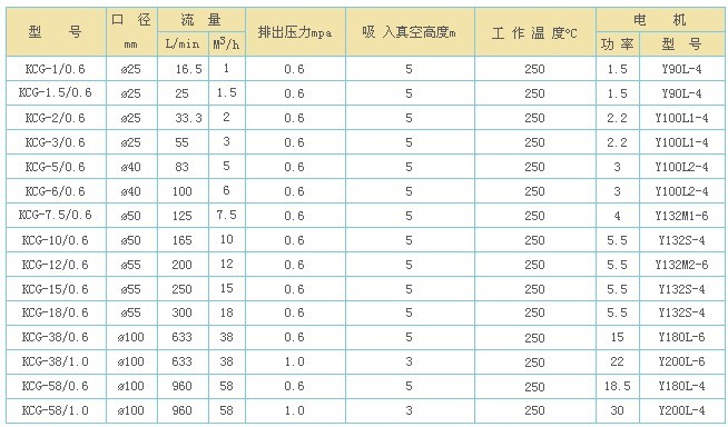 KCG高溫齒輪油泵,KCG高溫泵用途塑料橡膠加工工業(yè),紡織印染工業(yè),涂料工業(yè),木材加工工業(yè),食品業(yè)、造紙印刷等液態(tài)熱載體加熱載體加熱傳輸?shù)雀鞣N工業(yè)。 KCG高溫齒輪油泵,KCG高溫泵應用范圍 KCG高溫齒輪油泵適用于輸送不含固體顆粒和纖維,無腐蝕性的高溫液體,介質(zhì)溫度可達250℃,粘度為5-1500cst。結(jié)構(gòu)型式 KCG高溫齒輪油泵由齒輪、軸、泵體泵蓋、軸端密封等零部件組成,所有零件均選用合適的耐溫材料制造。KCG高溫齒輪油泵,KCG高溫泵內(nèi)運轉(zhuǎn)零件均利用其輸送的介質(zhì)潤滑KCG高溫齒輪油泵,KCG高溫泵配有保護閥,KCG高溫齒輪油泵,KCG高溫泵可防止超載對泵和電機造成損壞。常用KCG高溫齒輪油泵性能參數(shù)表