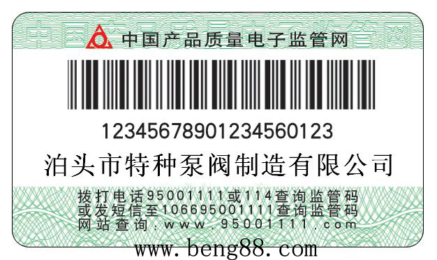 泊頭市特種泵閥制造有限公司自2008年5 月1 日出廠的產(chǎn)品,在產(chǎn)品合格證上粘貼長方形監(jiān)管碼標(biāo)簽,上有20位數(shù)字,這就是產(chǎn)品監(jiān)管碼。因此,我公司生產(chǎn)的每件產(chǎn)品都將有一個“電子身份證”。可以利用固定電話、手機短信、互聯(lián)網(wǎng)、超市終端等網(wǎng)絡(luò)通訊設(shè)備對電子監(jiān)管碼進(jìn)行查詢,辨別真?zhèn)?。查詢辦法如下: